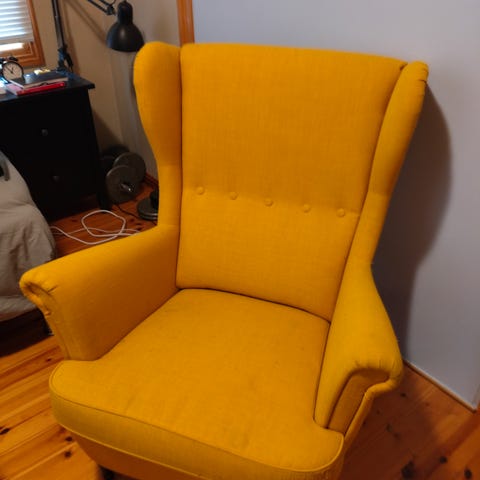 Selger en stilig og komfortabel gul lenestol fra IKEA. Den har litt skade. Men det kan enkelt fikses. Du må komme og hente den hos meg.