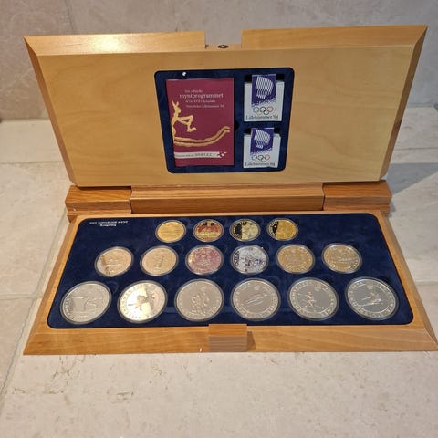 Den Kongelige Mynt OL Lillehammer 1994 gullmynt i original trekassett. Mynten leveres i innfelt holder med nummerert sertifikat fra Den Kongelige Mynt. Trekassetten har tilpasset innredning for mynten og sertifikatet, samt ytre beskyttelseseske merket «Gullmynt nr. 4» og Lillehammer 94-logo. Egner seg som samlerobjekt innen norske minnemynter og OL-relaterte utgivelser.