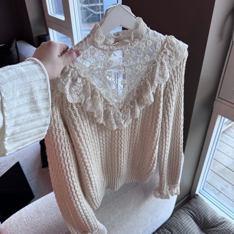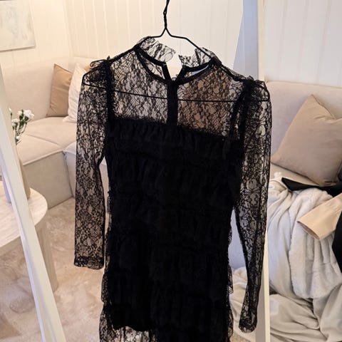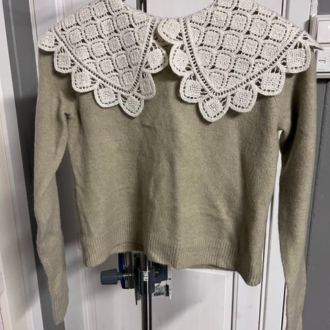Zara topp for dame i størrelse S. Toppen er svart med strukturert mønster i stoffet og har en kontrastfarget, kremhvit krage med volanger og knapp bak. Hovedmaterialet er polyester, med innslag av andre fibre for elastisitet og komfort. Passer som overdel til hverdagsbruk eller mer pyntede anledninger.