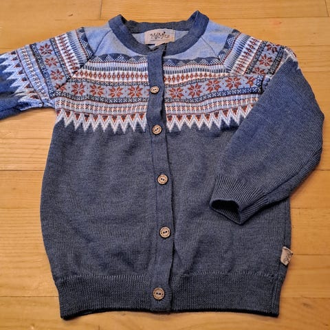 Har også en tilsvarende cardigan i blått, str 98/104. Mulighet for søskenmatch.