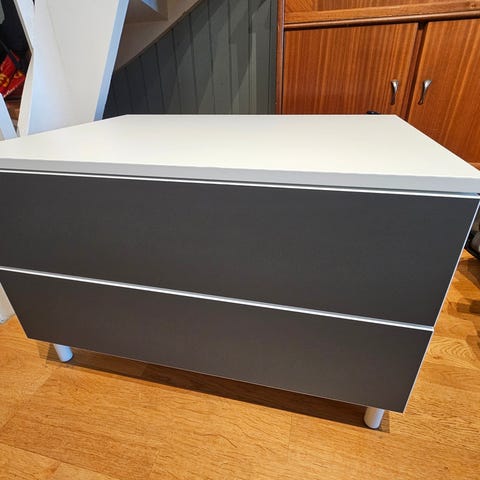 Hei. Bestå seksjon/TV-møbel gis bort mot henting. Tre skuffer, to grå, en hvit. Har synlige bruksmerker, og det er laget ikke så pent hull til kabelgjennomføring, men ellers er den hel og i god stand.