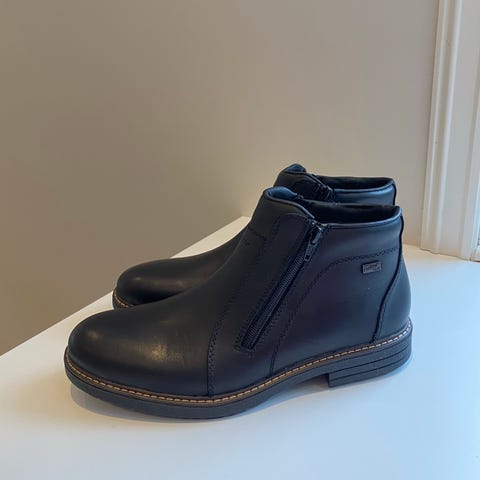 Rieker støvler i størrelse 42. Modellen er en ankelhøy snørestøvel i brun farge. Overdel i skinn med tekstilpartier ved hæl og krage. Kraftig yttersåle i gummi med grovt mønster for godt grep. Egnet som hverdagsstøvler i kjøligere vær.