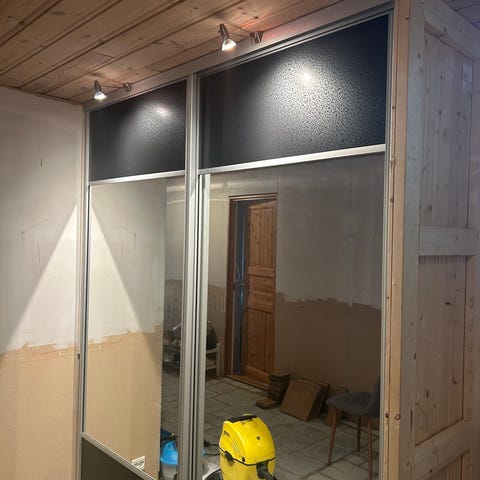 4 stk meget pent brukte skyvedører til garderobe selges. Disse er spesialbestilt grunnet ukurante mål. Målene på en dør er 149 cm høy og 106 cm bredde, så det gir over 4 meter i bredden. Skinne i toppen og bunn følger med.