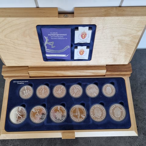 Lillehammer 1994 OL minnemyntsett i treskrin. Sett med ulike mynter og medaljer knyttet til de XVII olympiske vinterleker på Lillehammer 1994, presentert i et lakkert treskrin med innfelt lokk. Myntene ligger i blå fløyelsinnredning, alle i kapsler. I lokket følger hefte/sertifikat. Egner seg som samlerobjekt for mynter og OL-relaterte effekter. Original pappeske og isoporbeskyttelse er med.