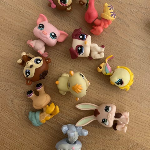 Littlest Pet Shop små figurer med ulike dyr. Pakken inneholder flere plastfigurer i ulike farger og fasonger, blant annet fugl, katt, bjørn og andre fantasidyr. Figurene er i liten størrelse og egner seg til lek, samling og tilbehør i andre Littlest Pet Shop-lekeverdener. Laget i hard plast med malte detaljer og bevegelige hoder på enkelte av figurene...10 stk selges samlet for 400kr