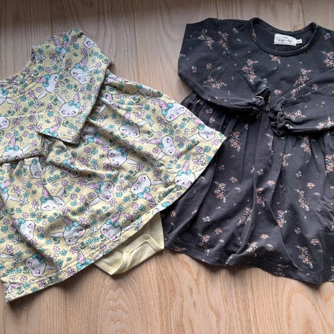 Smekken er lang, 43 cm, og kommer med strikk i mansjettene. En smekke barn vil kunne bruke i rundt 2-3 år. Til å begynne med er det bare å brette opp armene.