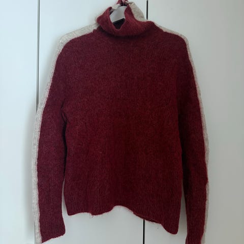 Ullgenser/strikkegenser i ull til dame i størrelse M. Genseren er hvit og har et grovt, håndstrikket uttrykk med hullmønster foran og på ermene. Den har høy hals og vide ermer, samt ribbekanter nederst på bol og ermer. Passer til hverdagsbruk på kjølige dager.
