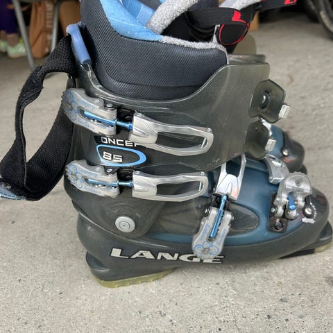 Lange Starlett alpinstøvler i størrelse 25.5 (298 mm sålelengde). Støvlene har fire spenner for justering av passform og god støtte rundt ankel og legg. Fargekombinasjon rosa og hvit med polstret, svart innerstøvel for økt komfort. Egnet til alpint bruk med standard alpinbindinger.