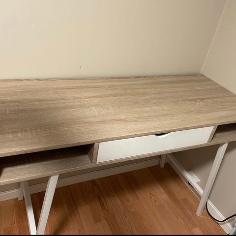 ABBETVED skrivebord i lys eikefarget/hvit fra jysk med hyller og skuff. Pent brukt.