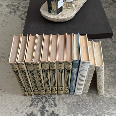 Samling med innbundne bokserier i klassiske verker. Bøkene har dekorative rygger i hovedsak i rødt, hvitt og brunt skinnbind med gullpreg. Flere av seriene har ensartet design på ryggene med tittel og forfatternavn i gullskrift på mørke felt. Egner seg som leseeksemplarer og som dekorative innslag i bokhylle eller bibliotek. Antall bind og konkrete titler fremgår av bildene.