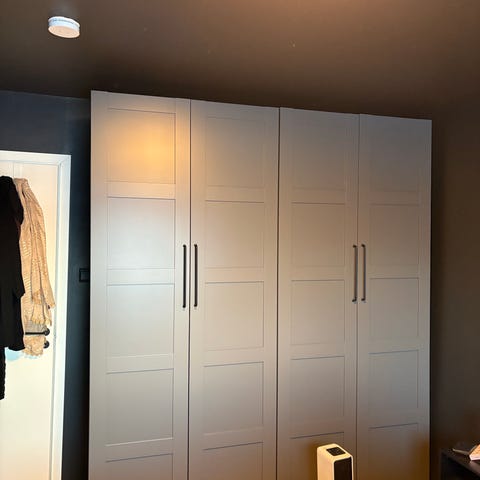 Selger et hvitt garderobeskap som består av to separate deler (overdel og underdel). Dette gjør skapet enklere å transportere og flytte.