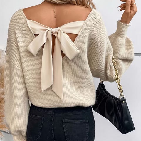 KappAhl genser for dame i størrelse XS. Genseren har lang erm, og åpen rygg med knyting øverst bak.