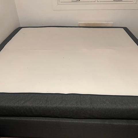 Selger en seng i lyst tre, størrelse 150x180 cm. Sengen har et avtagbart svart trekk som festes med borrelås. Den er ca. 10 år gammel, men fortsatt i god stand. Madrassene følger med, men overmadrass er ikke inkludert. Det er en liten flekk på sengen, ellers er den fin.