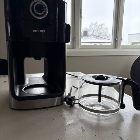 En godt brukt kaffemaskin, kjøpt ny i november 2017 på komplett. Fungerer fortsatt like bra, noen bruksmerker her og der. Men alt i alt veldig fin. Selges da vi har kjøpt oss integrert. Kan både bruke bønner og malt kaffe.