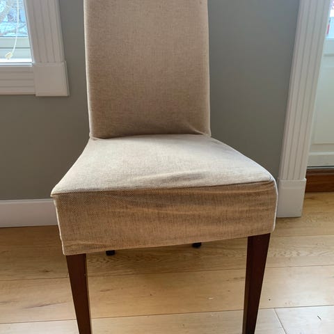 Selges syv spisestuestoler som ser helt nye ut. Stolene er i et grått stoff med bein i lys eik. Passer veldig fint til et spisebord jeg også selger. Se annonse: