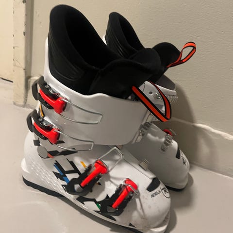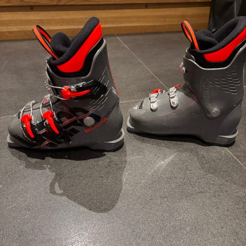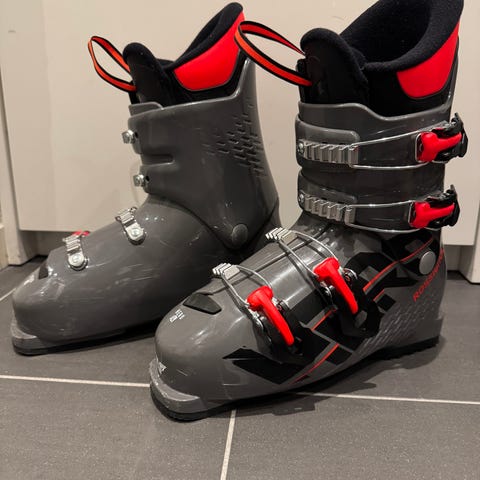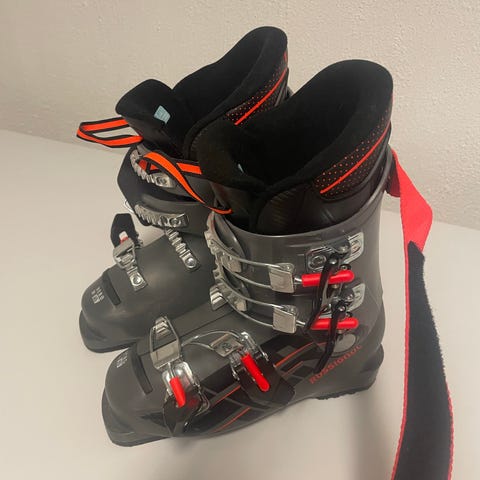 Rossignol skistøvler i størrelse 255 mm (mondopoint 25,5). Støvlene er i fargen svart med røde og sølvfargede detaljer. Modellen har fire spenner og powerstrap øverst for å gi god justering rundt fot og legg. Passer til alpinski og bruk i alpinanlegg. Egnet for ungdom eller voksne som bruker tilsvarende skostørrelse, avhengig av fotlengde og passform.