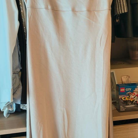 Kjolen har en dyp, rund hals med «flettekant» og pene legg som gir stoffet et fint fall over brystet. Kjolen er ermløs med et pent snitt på skulderbåndene.