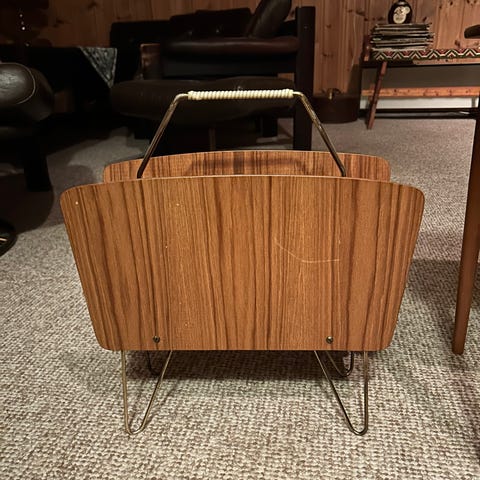 Retro aviskurv i teak med messinghåndtak. Godt brukt med bruksmerker.