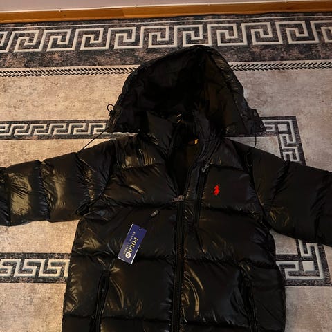 Ralph Lauren Polo vinterjakke i dun for herre i størrelse S. Jakken er svart og vattert med dunfyll for varme. Den har hette, glidelåslukking foran og lommer i sidene med glidelås. Klassisk Polo Ralph Lauren-logo på brystet. Passer som ytterjakke på kalde dager i vinterhalvåret. Meget pen og lite brukt, vært hos skredder og reparert /sydd et lite hull på armen bak, synes omtrent ikke.