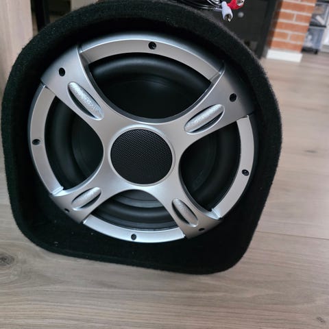 Ground Zero subwoofer med kasse for bruk i bilstereo eller hjemmeanlegg der det er behov for ekstra bass. Subwooferen er montert i en lukket/portet kasse med bassrefleksrør på fronten. På baksiden sitter en Ground Zero-forsterker festet direkte på kassen, med tilkoblingsklemmer for høyttalerkabler og strøm. Enheten er egnet som bassmodul i et eksisterende lydanlegg og kan kobles til en kompatibel spiller eller forsterker med riktige tilkoblinger og strømforsyning.