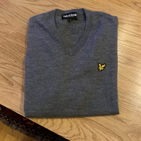 Lyle & Scott genser i ull for herre i størrelse M. Genseren er svart og har ribbestrikket kant nederst og på ermene. Den har krage med omslag og lukking foran, samt Lyle & Scott-logo på brystet. Passer til hverdagsbruk og som et ekstra lag på kjølige dager.