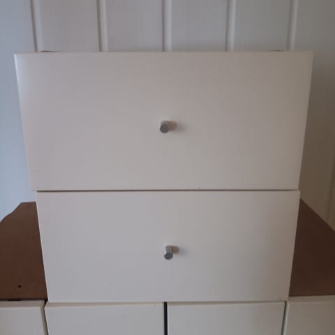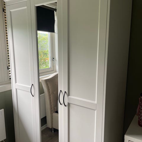 IKEA garderobeskap i hvit utførelse. Skapet består av høye skapdører med håndtak og integrerte skuffer nederst på den ene siden. Passer til oppbevaring av klær, sengetøy og annet tekstil i soverom eller gang. Nøytral hvit farge gjør at skapet kan kombineres med ulike innredningsstiler og annet møblement.