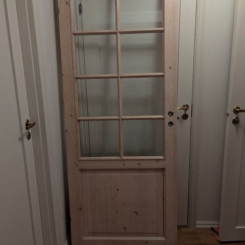 Fyllingsdører furu med hvitpigmentert lakk i klassisk profilert design og tre fyllinger. Døren leveres med montert låskasse.