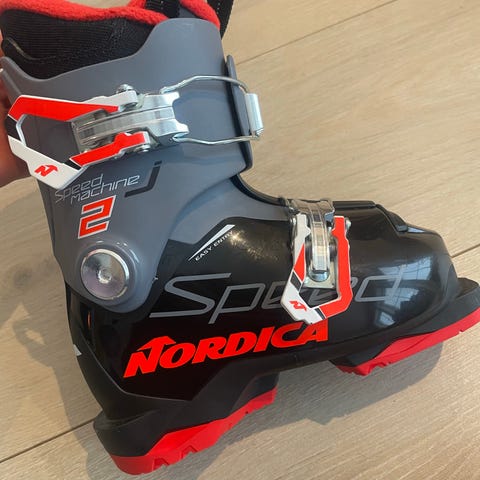 Nordica Speedmachine J3 alpinstøvler i størrelse 22.5. Støvlene er i fargene rød og svart.