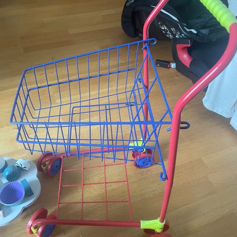 Colorful shopping cart for toddlers and young children. Can be used both as a push walker and for imaginative play (shopping, role play).