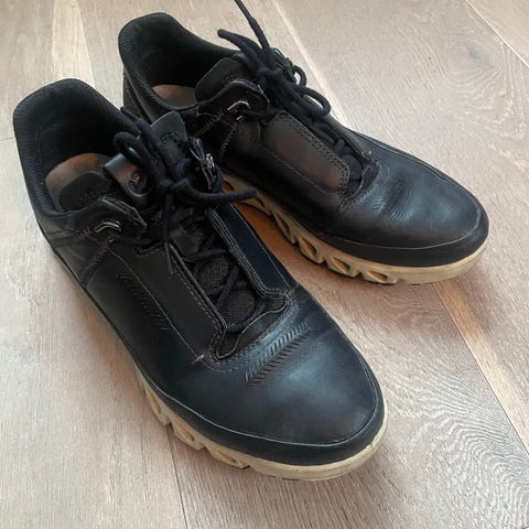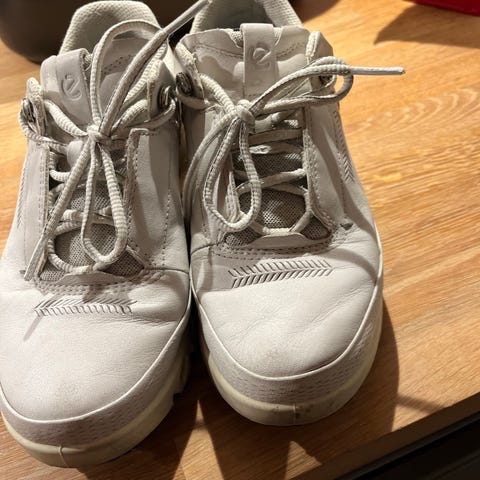 Ecco sneakers joggesko i størrelse 39. Modellen er lave joggesko med snøring. Skoene er i lys/hvit farge med mørk yttersåle med mønster for godt grep. Overdelen ser ut til å være i glatt materiale, og innsiden har myk polstring rundt hæl og ankel. Passer til hverdagsbruk og fritidsaktiviteter.