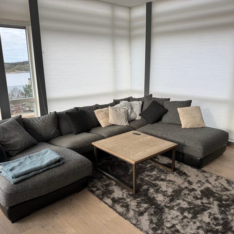 Stor, romslig og komfortabel hjørnesofa med sjeselong i moderne gråtoner. Perfekt for hverdagsbruk , besøk og filmkvelder.