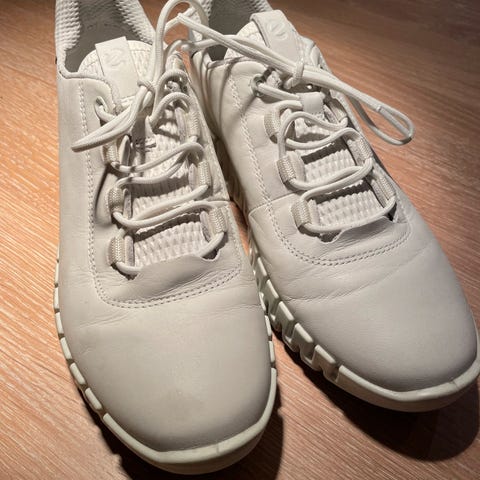 Ecco sneakers joggesko i størrelse 39. Modellen er i lys grå farge med snøring og perforerte detaljer i overdelen. Skoene har tekstilfôr og innersåle med ventilasjonshull. Yttersålen har grovt mønster for godt grep. Passer til hverdagsbruk og lett aktivitet.
