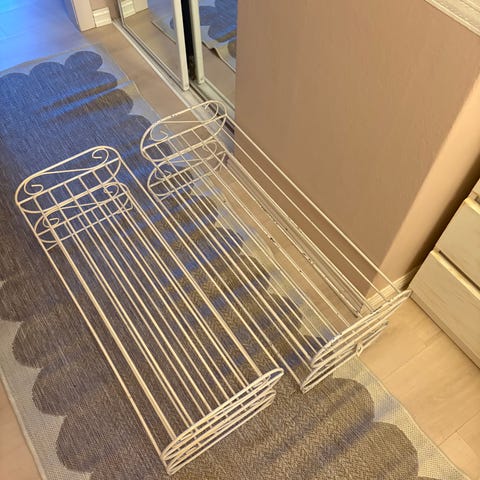 Tre stk stål reoler med 19 stk kurver og 4 stk skohyller, uttrekkbare.