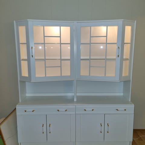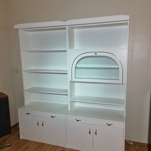 Hvit skjenk med én stor uttrekksskuff øverst og skapdel med to dører nederst. Innvendig i skapet er det hylle for ekstra oppbevaringsplass. Møbelet har en enkel, klassisk utforming med dekorlist på fronten og metallhåndtak på skuff og dører. Passer til oppbevaring i stue, gang eller soverom.