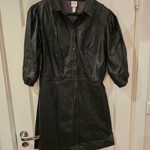 Just Female skinnkjole for dame i størrelse M. Kjolen er brun og laget i ekte mykt skinn. Modellen har korte ermer, krage og knepping hele veien ned i front. Passer til bruk alene som kjole eller som lag-på-lag-plagg over andre klær.