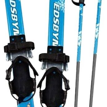 Åsnes barneski 97 cm med bindinger i blå og gule farger. Undersiden har mønstret såle som gir feste på snø uten behov for smøring.