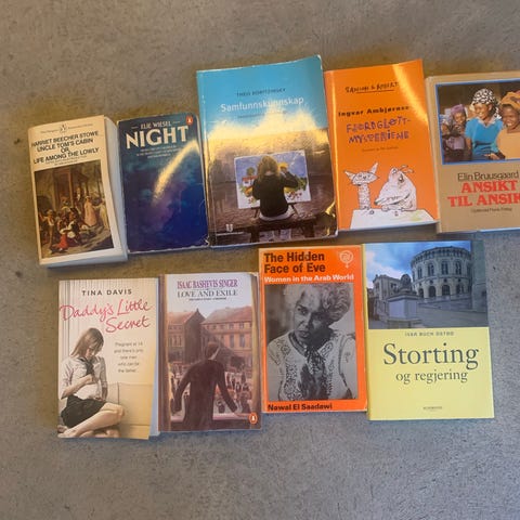 Bokpakke med diverse bøker i esker. Inneholder hovedsakelig skjønnlitteratur, inkludert flere innbundne bøker og klassikere. Noen bøker har dekorative permer og rygg, og det ser ut til å være både enkeltbind og serier. Bøkene leveres samlet slik de fremstår på bildene, og egner seg for lesing, samling eller som innslag i bokhylle og interiør. 2x banankasser
