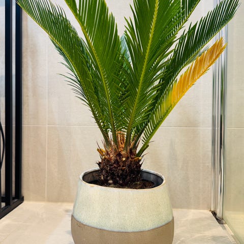 Den er tett og fin i veksten, står i en stilren potte og trives godt i lyst rom. Perfekt for deg som ønsker en tropisk følelse hjemme 🌿