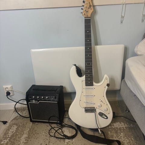 Sett med elektrisk gitar og forsterker. Gitaren har klassisk Stratocaster‑inspirert form, svart lakkert kropp og hvitt plekterbrett. Den har tre single‑coil pickuper, femveis pickup‑velger, volum- og tonekontroll, samt tremolo-bro. Halsen har gripebrett i tre med båndmarkeringer.