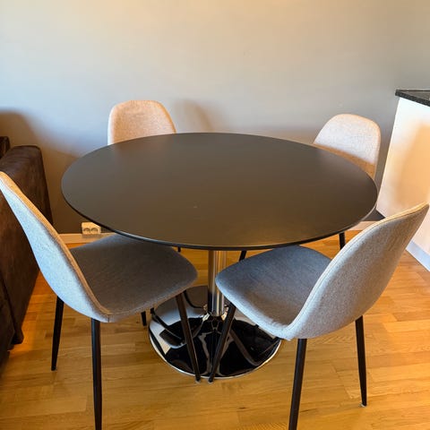 Pent Smokey spisebord fra Bohus selges. Et stabilt og stødig bord. Folien har dessverre løsnet litt på kanten, men er limt og synes ikke veldig mye, se bilde. Selger kun bordet. Diameter 120cm