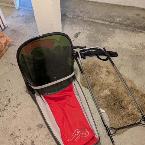 Fjellpulken barnepulk / pulk / snøpulk / vinterpulk / fjellpulk i rød og grå farge.