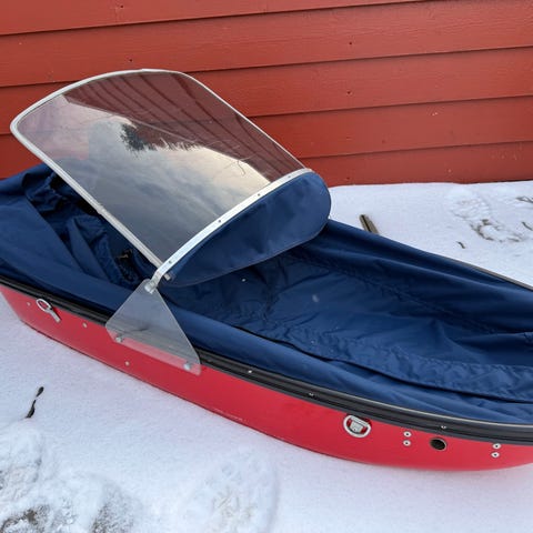 Pulken har trekk med vindu foran som skjermer barnet mot vær og vind. Drag følger ikke med.