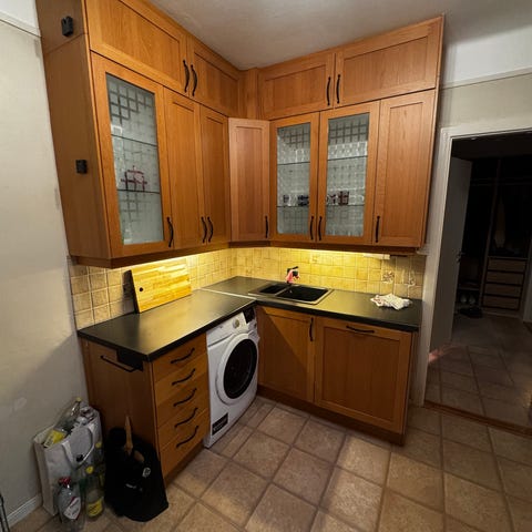 Dette er et gammelt kjøkken som er godt tstt vare på og pent brukt av hun som eide det. Nå skal vi bytte til nyere (kjedeligere) kjøkken så sjekker interessen her.