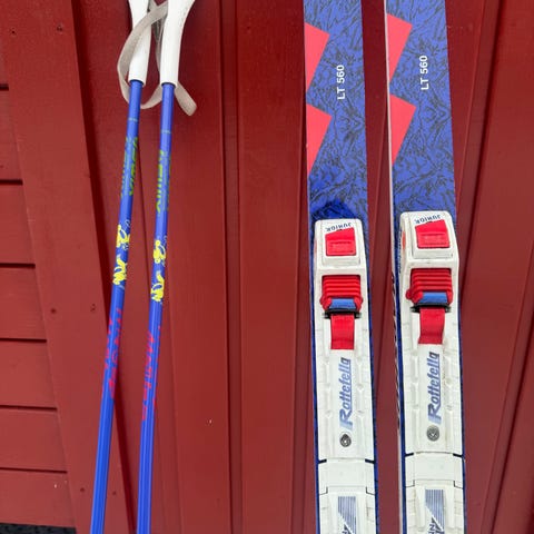 Madshus langrennsski 97 cm med Rottefella bindinger og Swix skistaver. Skiene har integrerte Rottefella-bindinger som passer til aktuelle skisko med tilsvarende sålesystem. Undersiden av skiene har mønstret såle for feste. Swix-stavene er 80 cm lange.