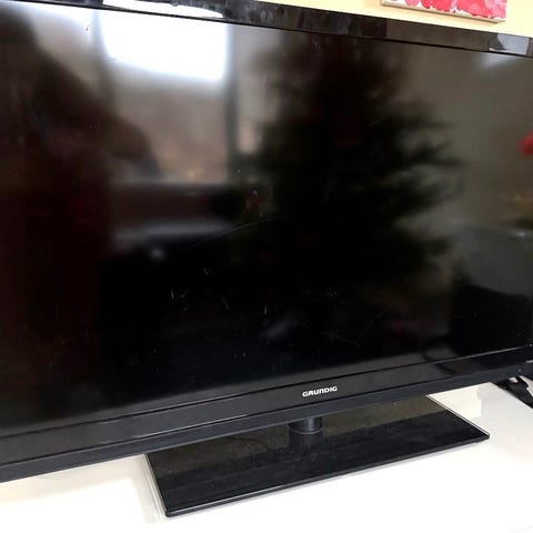 Philips TV med rektangulær fot og sort ramme. TV-en har HDMI-inngang og innebygde høyttalere på baksiden. Strømkabel er tilkoblet direkte i TV-en. Egnet som vanlig TV eller som skjerm til ulike enheter som dekoder, spillkonsoll eller PC via HDMI, avhengig av tilkoblingsmuligheter på utstyret som brukes.
