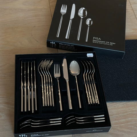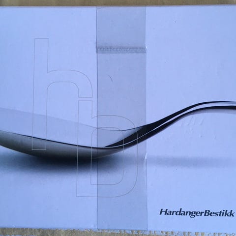 Hardanger Bestikk kakesett i rustfritt stål i sølvfarge. Settet inneholder kakespade og flere kakegafler, levert i original eske med formtilpasset innmat.