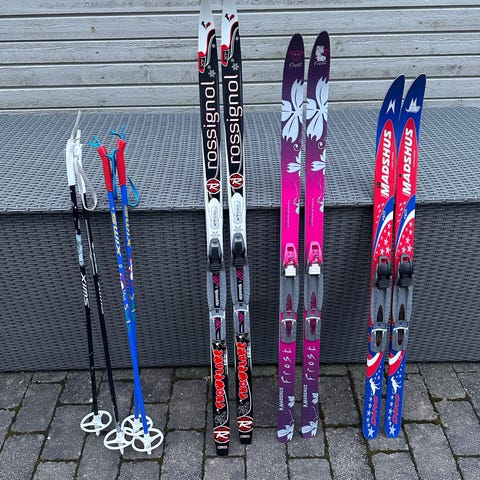 Madshus Superkid langrennsski i hvit og rød farge. Skiene har integrerte langrennsbindinger som passer til klassisk barnesko med tilsvarende bindingssystem. Overflaten har grafikk i rødt, hvitt og svart. Leveres som komplett skipar med tilhørende staver i lys farge, egnet til klassisk langrenn for barn.