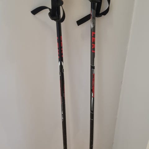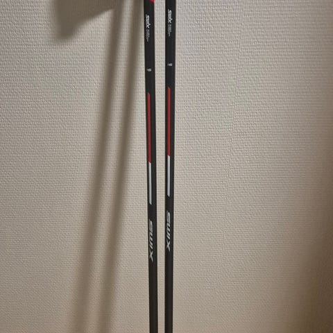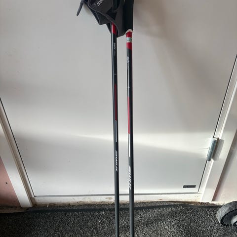 Swix skistaver på 120 cm i hvit og rød farge. Stavene har håndtak med justerbare stropper merket Swix, og grep i gummi for bedre hold.