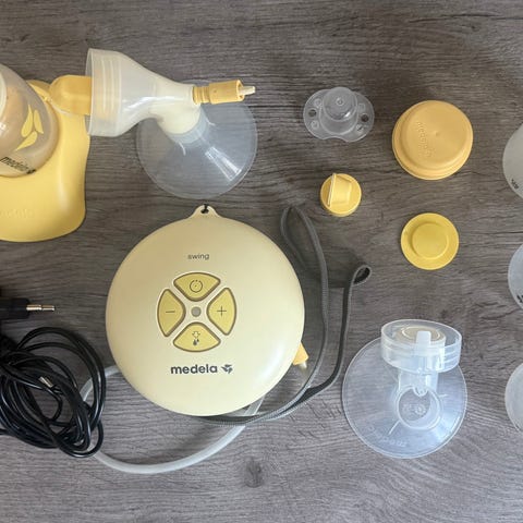 Medela Swing elektrisk brystpumpe med tilbehør. Settet inkluderer elektrisk pumpeenhet med slange, brysttrakt og pumpehode, samt flasker og lokk i plast. Pris: 990,- (Ny pris 1200)