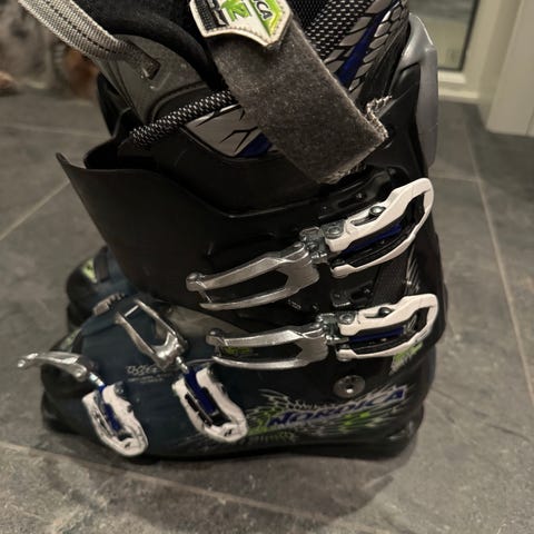 Ett par blå Nordica alpinstøvler med yttersålelengde 308 mm. Støvlene har flere spenner foran og justerbar stropp øverst for god tilpasning.